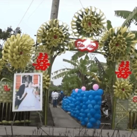 Thay vì kết cổng cưới bằng hoa hay vải lụa, bóng bay như các tỉnh thành miền Bắc. Ở miền Tây họ lại chọn chất liệu là lá dừa, lá cọ để tạo thành chiếc cổng cưới vô cùng đẹp mắt và ý nghĩa.
